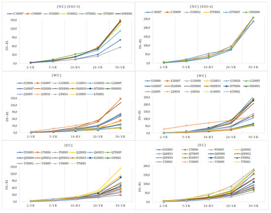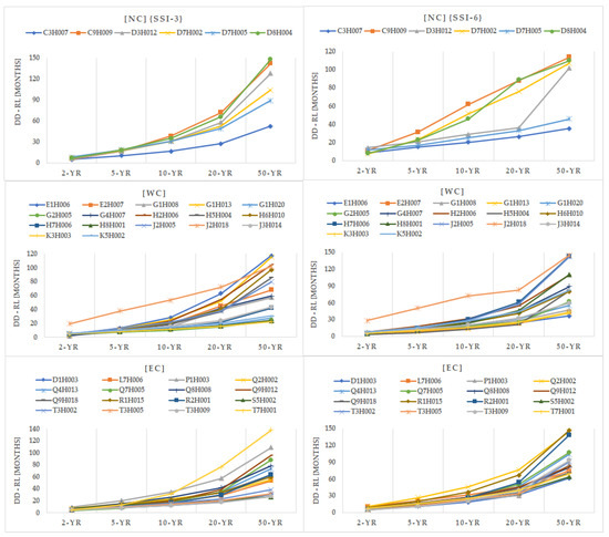 The results for the return levels of DS associated with the 2-, 5-, 10-, 20- and 50-year periods are shown in Figure 10 for 3- and 6-month accumulation periods. Similar to DD, the estimated return levels for DS increase with increasing periods. The 2-year return levels for DS range from the lowest of 1.4 to maximum severity of 5 in the WC to 1.2–4.6 in the EC and to 2.1–3.5 in the NC provinces. The severity doubles for the 5-year period across the stations and provinces. A significant increase in drought severity is recorded for the 20- and 50-year periods, reaching a maximum severity of 55.6, 55.0 and 48.8 for the 20-year period and in the NC, WC and EC provinces, respectively. The severity of hydrological drought is expected to double in magnitude in 50 years, as compared to the 20-year analysis period. A similar increasing pattern of DS return levels is observed for the 6-month accumulation time-step. While drought is expected to become severe in the future, the WC is likely to experience less severity. On the contrary, drought is likely to be more severe in the NC region, followed by the EC province.