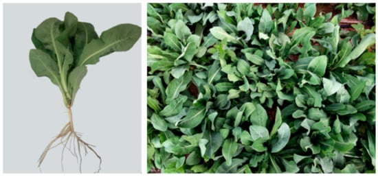 The Hexi Corridor is the main cultivation area of woad (Isatis indigotica) in China due to its unique climatic conditions. However, the shortage of water resources restricts the development of woad plantations. The use of reasonable irrigation planting methods is the key to solving the current problem. Woad (Figure 1) is a traditional Chinese medicinal material, and its leaves (large green leaves) and dried roots (Isatis root) can be used as a medicine, with heat-clearing, detoxification, pharyngeal, pain-relieving, blood-cooling, and anti-inflammatory effects. Woad root can be processed into granules (Isatis root granules). The product is very popular in China and is most often dissolved in hot water or tea [1]. It is the most commonly used heat-clearing and detoxification medicine in China [2,3,4], and is one of the six drugs recommended by the Chinese government for the prevention and control of severe acute respiratory syndrome (SARS) [5]. In recent years, pharmacological studies have found that woad has obvious antiviral activity, as well as anti-inflammatory, anti-tumor, anti-cancer, anti-endotoxin, and immunity enhancement effects [6]. It is clinically used for the treatment of febrile toxin, high fever headache, chickenpox, measles, influenza, and various inflammations of the digestive and respiratory systems. As a type of indigo dye and medicinal plant, woad has become the most important dye in the denim industry because of the absorbability of its indigo pigment to cotton fiber and its non-covalent combination [7]. At present, it is also used in the cosmetics industry, mainly in the production of soaps and creams [8].