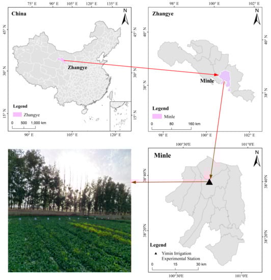 The experiment was performed from May to October 2017 to 2019, at the Yimin Irrigation Experimental Station (Figure 2) in Minle County, Gansu Province, China. The experimental station is located at the east end of the Hexi Corridor in Gansu Province (38°39′ N, 100°43′ E). The average altitude at the experimental station is 1970 m (m), and the area has a typical continental desert grassland climate. The multi-year average precipitation and evaporation are 200 and 1638 mm, respectively. The dryness index is 5.85, and the annual sunshine duration is 2932 h (h). The multi-year average temperature is 7.6 °C, and the cumulative temperature is 3500 °C above 0 °C and 2985 °C above 10 °C over the course of a growing season. The rainfall in 2017, 2018 and 2019 were 196.5, 210.3 and 191.3 mm, respectively. The soil type of the farmland is a light loam, the maximum field water capacity is 24% (gravimetric moisture content), there are about 150 frost-free days, and the soil bulk density is approximately 1.46 g per cubic centimeter (g·cm−3). The contents of the soil organic matter, alkali-decomposed nitrogen, available potassium, and available phosphorus in the 0–20 cm soil layer, based on three-year averages, were 12.4 g per kilogram (g·kg−1), 57.3 milligrams per kg (mg·kg−1), 191.7 mg·kg−1, and 15.9 mg·kg−1, respectively. The groundwater table was measured at a depth of approximately 20 m, and there are no saline-alkaline effects in this area. The study site had low rainfall with uneven distribution and insufficient river water supply, leading to an outstanding contradiction between water supply and demand as well as frequent drought stress.
