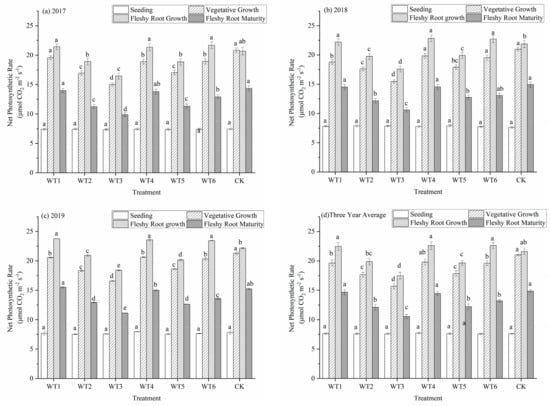 The physiological indices of crops are affected by rewatering after water deficit, which is also one of the core contents of the research on regulated deficit irrigation theory. The Pn and Gs of WT2 during the fleshy root growth period were 1.12% and 7.31% higher, respectively, than those in WT5. This indicated a certain compensation effect after rehydration. A prior study drew a similar conclusion that the Pn, Tr, and Gs of kidney beans were reduced by water deficit, however after rehydration these characteristics were restored but with different recovery rates [32]. The Pn and Tr recoveries were synchronous, but Gs recovered relatively slowly. This might be correlated with the decrease in the soil water content that caused a variation in the leaf water potential. The photosynthetic characteristics of woad improved by timely and moderate water deficit regulation, similar to a study on winter wheat [33].