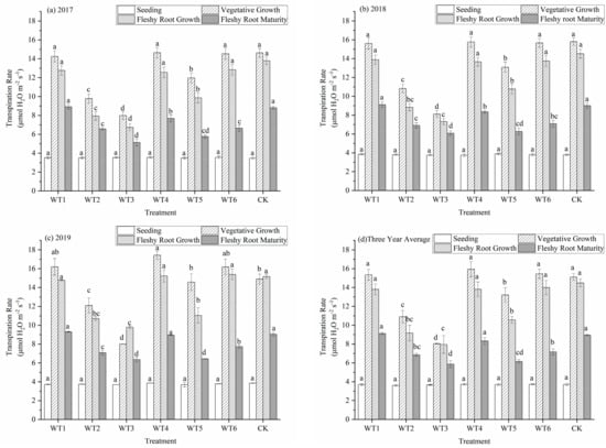 Transpiration rate of woad (Isatis indigotica) under different water deficit treatments. Different lowercase letters within a column indicate a significant difference among treatments at p < 0.05.