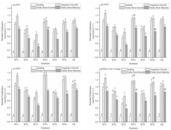 Stomata are the main outlet of water vapor in the process of plant transpiration and also the channel of gas exchange during photosynthesis and respiration. During gas exchange between plants and the atmosphere, water deficit leads to decreased turgor pressure of mesophyll cells and finally to decreased stomatal conductance (Gs). With growth stage progression, Gs in each treatment gradually increased, mainly from the seedling to the vegetative growth period. The Gs at fleshy root growth reached the maximum and began to decrease after entering the fleshy root maturity period (Figure 5). The variation of Gs in each treatment at the seedling stage was the same, with no significant difference. During the vegetative growth period, the Gs of WT4 (1.16 mol·m−2·s−1) was the highest and did not differ significantly from that of WT1, WT6, and CK. Compared with CK, the Gs of WT2, WT3, and WT5 were significantly reduced by 23.30%, 46.60%, and 22.33%, respectively. This indicates that mild water deficit regulation increased Gs, but moderate and severe water deficit significantly decreased Gs. There was no significant difference among WT1, WT4, and WT6 at the fleshy root growth period, while WT1 was significantly increased by 15.6% compared with CK on Gs. This shows that rehydration after mild water deficit regulation had a certain compensation effect. The Gs of the severe water deficit regulation of WT3 (0.38 mol·m−2·s−1) was the lowest at fleshy root maturity, which was significantly reduced by 55.81% compared with CK. This indicates that the influence of water deficit regulation occurred after severe water deficit regulation during vegetative growth, and rehydration had little influence on Gs.