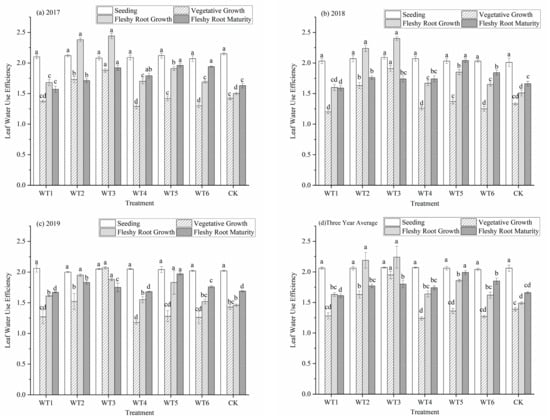 Water use efficiency of leaves of woad (Isatis indigotica) under different water deficit treatments. Different lowercase letters within a column indicate a significant difference among treatments at p < 0.05.