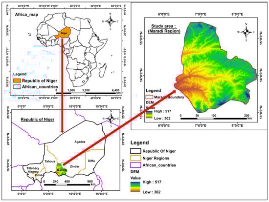 In this context, the satellite remote sensing can be a convenient way to solve the problem. Remote sensing (RS) provides data over vast regions, with the ability to visit the same land area regularly. Furthermore, it can make an important contribution to regional soil erosion risk assessment through the rapid derivation of appropriate indices [48,49,50]. GIS and remote sensing are widely applied in many research areas, mainly in flood risk assessment, which is directly associated with soil erosion, as extreme hydrological events generate soil erosion and sediment transport. According to Tzioutzios, 2020, by taking advantage of the advanced capabilities offered by GIS, this task can be expedited, so that results and decisions are less time consuming, more efficient, and more accurate [50]. The use of GIS and spatial data plays a leading role in this area; by applying simple spatial techniques to the datasets and combining them with the RUSLE model. GIS and RS allow the use of spatial data of different types. Confirming this, recently made available datasets and technologies (satellite data and GIS) provide an adequate spatial and temporal accuracy, which ultimately leads to better flood risk reduction [51].Additionally, there have been some published studies on the application of RS and GIS technologies for soil erosion modelling in other parts of the world [52], yet little or no work was found on the application of GIS for erosion modelling in south-central Niger (Maradi region).