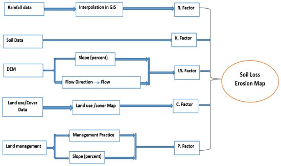 Flow chart for the analysis of soil loss based on the RUSLE model, remote sensing, and GIS technique.
