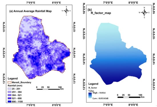 Rainfall Erosivity (R factor): rainfall erosivity is the most important factor in RUSLE and responsible for soil erosion in an area. It is a long-term average of rainfall erosivity. Thus, the R-factor describes the intensity of precipitation in a given location, based on the extent of soil erosion [58,59], which is essential for assessing soil erosion risk under future land use and climate change [59]. The R factor quantifies the influence of precipitation on the amount and rate of runoff factor [50,51]. In the present analysis, the rainfall erosivity was calculated using the mean annual rainfall data collected from two monitoring stations in the Maradi region (Madarunfa rainfall station in the south of the region and Fako rainfall station in the north). In this section we used the Renard and Freimund (1994) equation, which establishes a relation between (R) and the average annual rainfall. Furthermore, it can be used for locations with a mean annual precipitation of less than 850 mm. The following formula was used to calculate the R factor: