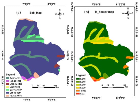 The K-factor represents the sensitivity of a soil to the isolation and transfer of soil particles. It reflects the combined effect of the soil’s properties and shows the general tendency for erosion of a particular soil type [29]. Soils that have different properties have different resistances to erosion. Erodibility, therefore, varies with the physical and biochemical properties of the soil, such as soil texture and structure, aggregate stability, shear strength, infiltration capacity for organic matter, and chemical content. The respective K-factor values for each soil type were assigned based on the existing soil types in the study area [60,61].