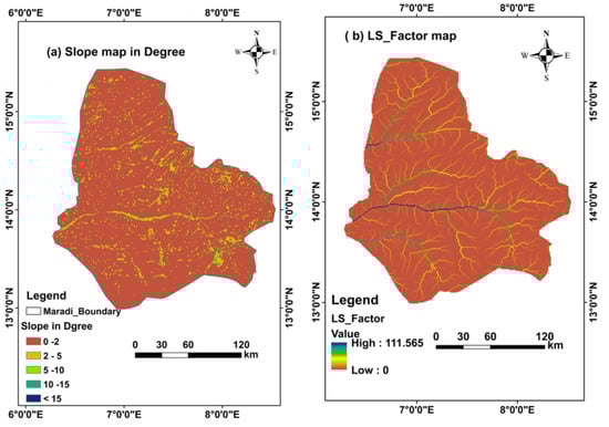 Slope length and steepness (LS-factor): the LS-factor is used to describe the influence of the topographic component on soil erosion. It considers the topographic aspect of a particular area for soil erosion. Here, the topographic aspect represents the susceptibility of the study area to topographic erosion. It represents the influence of slope length and steepness of the slope on the mechanism of erosion (Figure 5b). River accumulation and percentage slope were used as inputs for estimating the topographic component. In the central and southern parts of the study area, the slope is high. Moreover, the slope maps identify areas with a high potential runoff and, therefore, high erosion rate; these potentials reduce as the slope degree drops from a high to a low slope degree (Figure 5a). Furthermore, the LS-factor ranged from 0 (lower part) to 111.565 (upper part). Higher LS-factor values prevailed in the central and eastern parts of the study area. The phenomenon indicates that the soil loss will increase with slope length and slope steepness. Soil loss increases faster with slope length than with slope steepness. A holistic analysis of all soil loss factors revealed that LS-factor has a significant effect on the estimation of total soil loss in the study area.