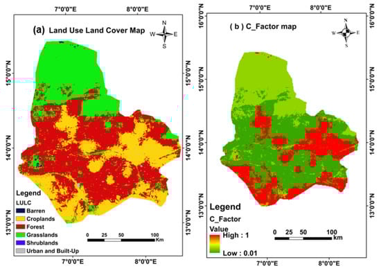 (a) Land use/land cover map and (b) land cover management (C-factor) map.