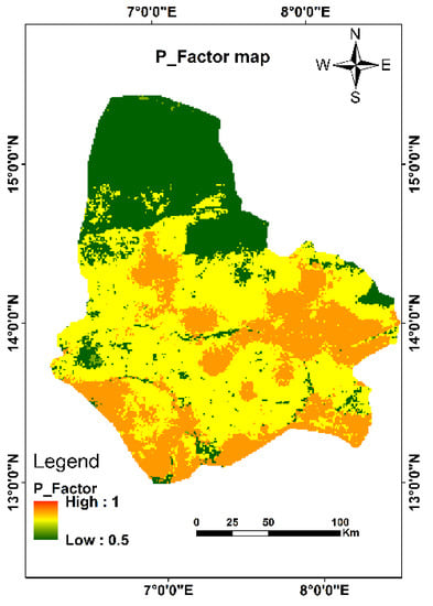 Conservation practices (P-factor): based on the current land management practices used in the south Central Niger, the P-factor value varied from 0.5 to 1 (Figure 7). Thus, 0.5 represents a very strong facility for protection against human erosion and 1 represents no facility for protection against human erosion [69,70]. Based on the results, lower P-factor values characterized the core area of the study zone, and higher P-factors characterized the upper part of the study area. In addition, the relevance of conservation measures increased soil erosion vulnerability. In the study area, the lower P-factor values were concentrated in the southern part of the study area, and the higher P-factor values were distributed in the upper and outer parts of the area.