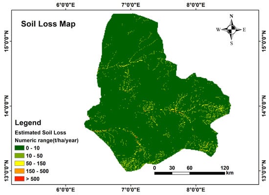 As a result of the final soil loss model, Figure 8 shows the annual erosion map of the study area, which helps to identify the areas prone to soil erosion. This finding was supported by data from field studies in our regions with a similar environmental condition [71], where there is a high level of erosion that affects the soil and this many detrimental effects due to downstream sedimentation.