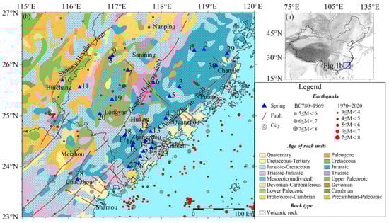 (a) Localization of the study area. (b) Geological map showing the location of the thermal springs, historical earthquakes and major faults of Fujian.