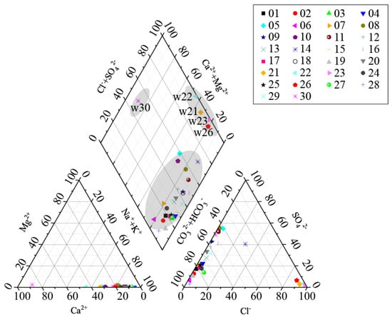 Piper diagram of sample thermal springs. The hot spring samples can be divided into three clusters according to the main ions. Among them, W30 obviously deviates from the others, whereas W21, W22, W23 and W26 have a similar chemical composition; the other 25 samples form a unique and the major category.