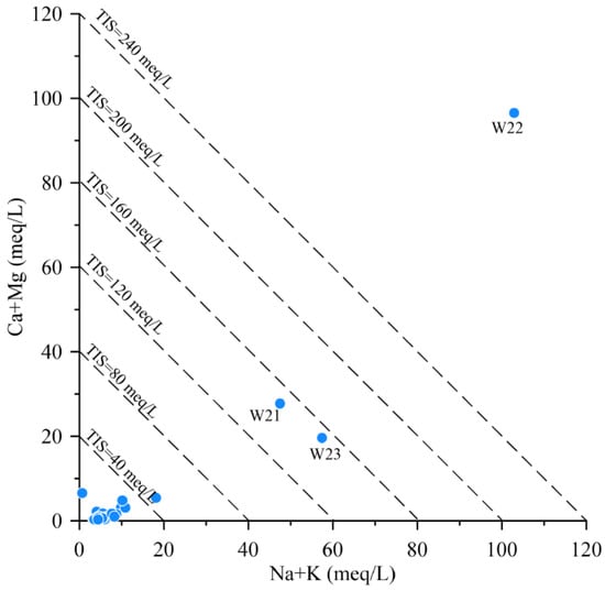 Correlation plot of Na+K vs. Ca+Mg for the sample thermal springs in the research area, also showing the iso-ionic-salinity (TIS) lines for reference.