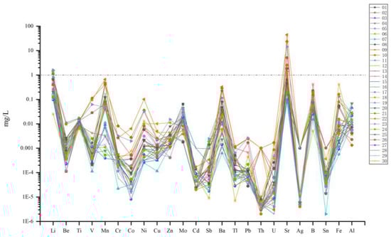 The element content of the hot spring depends on the water–rock reaction during the deep circulation of groundwater; therefore, the trace elements in thermal springs can show the degree of water–rock reaction to a certain extent (Table S2). The enrichment factor is the degree of enrichment of a certain element in a specific geological body, and the source of the trace elements in a thermal spring can be qualitatively determined according to the enrichment factor [35]. The calculation formula of the enrichment factor is
