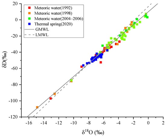Isotopic characteristics of the groundwater can provide a theoretical basis for analyzing the recharge source of groundwater. The measured values of δD and δ18O in the thermal springs ranged from −37.6‰ to −56.30‰ and from −5.5‰ to −8.7‰, respectively. The δD–δ18O relationship diagram (Figure 5) shows that the 30 sample points are scattered near the Global Meteoric Water Line (GMWL) and the Local Meteoric Water Line in Fujian (LMWL) [40,41,42,43,44,45], indicating that precipitation is the main source of recharge for thermal springs.