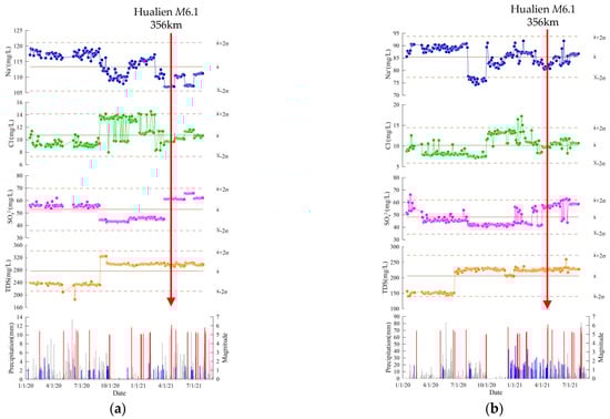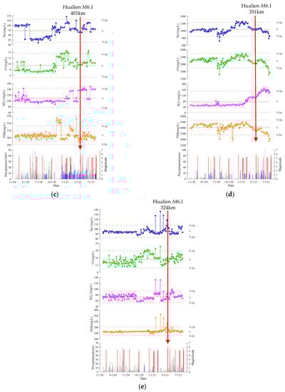 Temporal variations of concentration of Na+, Cl−, SO42−, TDS and precipitation: (a) the Tadou spring (W03); (b) the Longmen spring (W04); (c) the Tainei spring (W12); (d) the Gangwei spring (W23); (e) the Guian spring (W29). Blue bars show the near-field ML ≥ 1.0 earthquakes within 50 km and red bars show the far-field MS ≥ 5.0 earthquakes with 500 km; gray bars show the daily precipitation.