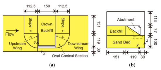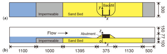 In this study, the FS3M was applied to the same computational domain, numerical cells, and boundary conditions as those used by Nakamura et al. [10]. Figure 1 illustrates the entire computational domain (length: 5.5 m, width: 0.30 m, height: 0.327 m). Figure 2 and Figure 3 illustrate the details of the bridge abutment and backfill (crown width: 150 mm, height: 77 mm, slope: 1/1.46). The bridge abutment and backfill were a 1/100-scale model of the Numata overpass in Iwate Prefecture, Japan, which was damaged during the 2011 Tohoku earthquake tsunami. In Nakamura et al. [10], such a small-scale model was used due to limited space at the facility. As depicted in Figure 1, a sand bed (length: 2.90 m, thickness: 0.10 m), abutment (Figure 2), and backfill (Figure 3) were set in the computational domain. The backfill had two quarter sections of an ogive on the upstream and downstream sides (left and right sides in Figure 3a) of the abutment. Table 1 lists the parameters of the porous material forming the sand bed and backfill, which have the same values as those of Nakamura et al. [10]. The critical Shields parameter for the horizontal bed and the settling velocity of sand particles were determined using Iwagaki’s formula [13] and Rubey’s equation [14], respectively. The x-, y-, and z-axes are defined in Figure 1. The horizontal along-channel direction with its origin on the upstream surface (left surface in Figure 1) of the abutment is defined as the x-axis; the horizontal cross-channel direction with its origin on the front surface (lower surface in Figure 1a) of the channel is defined as the y-axis, and the vertically upward direction with its origin on the bottom of the channel (Figure 1b) is defined as the z-axis.