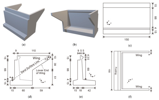 Bridge abutment (unit: mm): (a) three-dimensional (3D) view (outside); (b) 3D view (inside); (c) front view; (d) side view; (e) cross-sectional view; (f) top view.