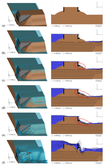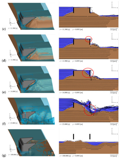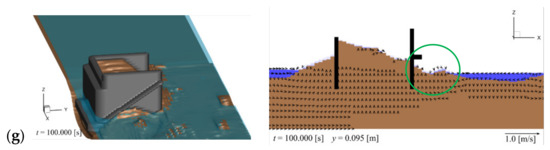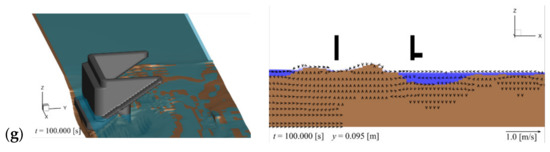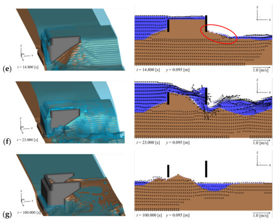 Backfill erosion around the abutment (left panel: 3D view; right panel: cross-sectional view at y = 0.095 m): (a) t = 0.0 s (initial); (b) t = 11.0 s; (c) t = 11.3 s; (d) t = 11.9 s; (e) t = 14.8 s; (f) t = 23.0 s; (g) t = 100.0 s (final).