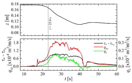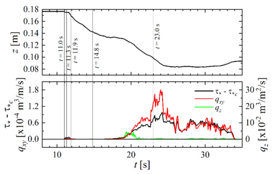 Figure 4d and Figure 5c depict the trend at time t = 11.9 s, where the backfill subsidence inside the abutment becomes distinct (red circle in the right panel of Figure 4d). In Figure 5c, the distributions of τ* − τ*c, qxy, and qz continue to follow the same trend as those on t = 11.3 s. However, the top panel of Figure 6 shows that the decrease in the elevation of the abutment z stops temporarily until t = 14.8 s on the downstream side of the downstream wing. In contrast, as shown in the top panel of Figure 7, the backfill elevation z continues to decrease on the upstream side of the downstream wing. This implies that the sediment is supplied from the upstream side to the downstream side of the downstream wing; hence, the backfill elevation z does not decrease on the downstream side.
