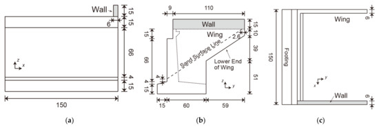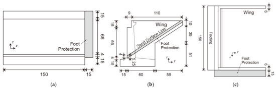 Figure 11. Countermeasure #2. Bridge abutment with the foot protection (unit: mm): (a) front view; (b) side view; (c) top view. - The upstream and downstream wings were extended downward to prevent the backfill inside the abutment from flowing out (Figure 12). This was based on the confirmation in Section 3 that after erosion on the downstream side of the abutment reached the lower end of the downstream wing, the backfill inside the abutment began to flow out from below the downstream wing. This countermeasure indicates an increase in the depth of the soil cover on the wings. This was called countermeasure #3.