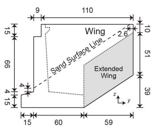 Figure 12. Countermeasure #3. Bridge abutment with the extended wings (unit: mm). - Countermeasures #1 (wall), #2 (foot protection), and #3 (extended wings) were implemented simultaneously and called countermeasure #4.