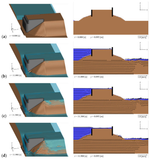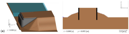 Figure 4 illustrates the backfill erosion and sand bed around the abutment. The left panel is a 3D view, where the abutment is shown in gray, the surface of the backfill and sand bed in brown, and the water surface in blue. The right panel is a cross-sectional view at y = 0.095 m, which corresponds to the cross-section around the joint of the abutment wings, as shown in the left panel of Figure 4a. The cross section of the wings is shown in black, the backfill and sand bed in brown, and the water in blue. The vectors represent the x- and z-components of the flow velocity. Figure 5 displays the values related to the sediment transport in the same case and at the same time as in Figure 4. The variables qxy, qz, τ*, and τ*c are listed in Table 2. When the value of qz is positive, it indicates that the amount of sediment pickup qp is larger than that of the sediment settlement qs. The contour lines in Figure 5 illustrate the backfill and sand bed elevation, the purple lines show the tops of the wings of the abutment, and the purple-filled boxes depict the top of the other part of the abutment.