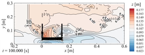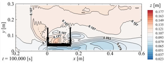 As shown in Figure 15b, at t = 11.0 s, although the tsunami begins to flow down along the downstream wing, which is similar to the no-countermeasure case (Figure 4b), the backfill erosion on the downstream side of the abutment is not yet formed owing to the presence of the foot protection. Subsequently, as shown in Figure 15c–e, the backfill begins to be eroded on the downstream side of the foot protection (red circle in the right panel). Due to this delay in the erosion progress, the lower surface of the downstream wing is exposed approximately 6.4 s slower than in the no-countermeasure case (Figure 4e). However, at t = 23.0 s, as indicated in Figure 15f, the erosion is not significantly different from the no-countermeasure case (Figure 4f) and countermeasure #1 (Figure 13f). Finally, the backfill is eroded (Figure 15g). Figure 16 illustrates the final backfill elevation z with countermeasure #2. Similar to countermeasure #1, countermeasure #2 marginally increases the amount of the residual backfill inside the abutment compared with the no-countermeasure case (Figure 9). However, the effect of countermeasure #2 on the z value could not be understood.