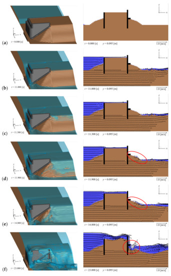 Figure 4f and Figure 5e illustrate the scenario at time t = 23.0 s where backfill erosion evolves inside the abutment. As shown in Figure 4f, the backfill around the downstream wing is lost, and the tsunami passes under the downstream wing (red circle in the right panel). Furthermore, as indicated in Figure 5e, the backfill on the side away from the abutment begins to be eroded. At this moment, the value of τ* − τ*c becomes large primarily around the downstream end of the crown of the backfill (green circle with solid line), along the ridge of the downstream slope (green circles with broken line), and at the scouring area downstream of the downstream wing (green circle with dotted line). This phenomenon leads to an increase in qxy at these locations, as shown in the left panel of Figure 5e. In addition, the value of qz also increases around the downstream end of the backfill crown. Figure 8 shows the time series of the backfill elevation z, τ* − τ*c, qxy, and qz at the center of the backfill crown away from the abutment (x = 0.075 m, y = 0.250 m). The ranges of t and qz in this figure are different from those in Figure 6 and Figure 7. Figure 8 indicates that the values of qxy and qz (red and green lines in the bottom panel) increase even at a position away from the abutment, resulting in a decrease in the elevation of the abutment z (top panel).