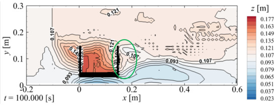 Figure 19b–d indicate that the wall prevents the tsunami from flowing along the downstream wing, which is the same as with countermeasure #1 (Figure 13b–d). Simultaneously, the flow passing through the area with no wall radiates down the ogive section of the backfill. This flow, as shown in Figure 19d,e, causes backfill erosion on the downstream side of the foot protection (red circle in the right panel), which is similar to the case with countermeasure #2 (Figure 15c–e). Figure 19f shows that the tsunami flowing over the wall deepens the erosion around the foot protection (red circle in the right panel). However, similar to the case with countermeasure #3, erosion in this case does not reach the lower end of the downstream wing. Figure 20 illustrates the final elevation of the backfill z with countermeasure #4. The figure shows the distributions of the z value inside the abutment on the upstream side of the abutment and on the side away from the abutment do not significantly change from the case with countermeasure #3 (Figure 18d). In contrast, as depicted in Figure 19g and Figure 20, the erosion on the downstream side of the abutment (green circles) is reduced comparable to the case with countermeasure #3 (Figure 17g and Figure 18d).