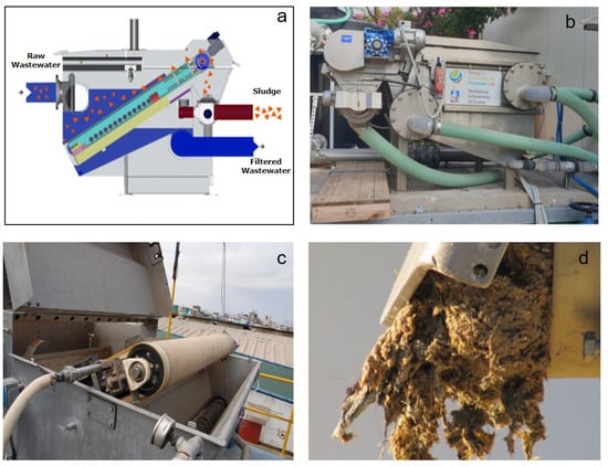 (a) Schematic diagram of rotary belt filter (microsieve), (b) photograph of microsieve used for MS sludge production, (c) fabric belt and auger in microsieve, and (d) MS sludge exiting the microsieve.