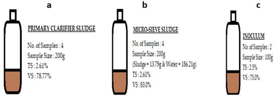 Four sets of bottles were prepared for each sludge mixture, while two sets of blank trials (bottles with inoculum–without sludge) were also carried out alongside, each time. The quantities of inoculum and substrate (mL) introduced in each vial are shown in Table 2.