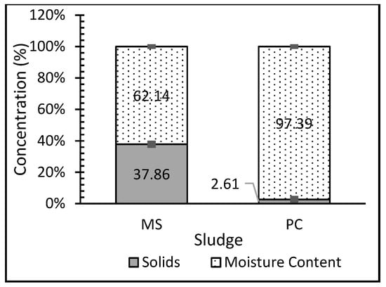 Naked eye observations showed PC sludge to be semi-liquid in comparison to MS sludge, which was much drier and solid in nature. TS analysis indicated that the average TS concentration for PC and MS sludge was 2.61 ± 0.08% and 37.86 ± 0.08%, respectively (Figure 3).