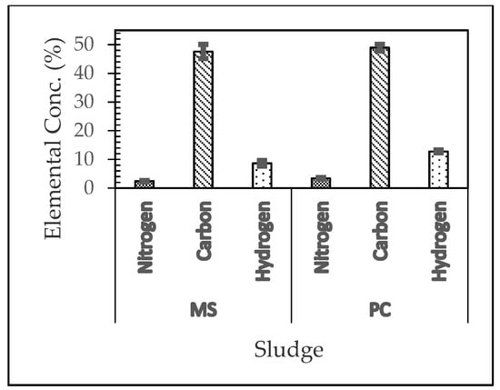 Elemental analysis showed that the average nitrogen, carbon and hydrogen concentrations of PC and MS sludges where 3.40 ± 0.21%, 48.95 ± 1.16% and 12.78 ± 0.49%, respectively, for PC sludge and 2.43 ± 0.21%, 47.60 ± 2.47% and 8.65 ± 0.92%, respectively, for MS sludge (Figure 5). Even if PC sludge indicated a higher concentration for all elements monitored, MS sludge exhibited a higher C/N ratio (19.68 ± 0.69), compared to PC sludge (14.46 ± 1.23). The latter suggests that although PC sludge showed a high content of nitrogen, carbon and hydrogen individually, MS sludge exhibited a better nutrient balance, an important issue for the progressing of anaerobic digestion and for biogas production.