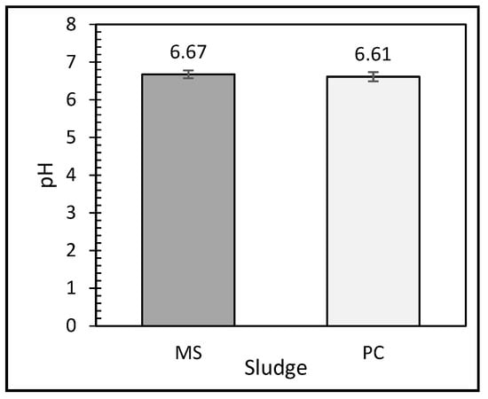 Although pH change over the course of AD process, it is wise to monitor the initial pH, to ensure that it lies within the desired range. PC and MS sludges indicated similar pH values, at 6.61 ± 0.10 and 6.67 ± 0.08, respectively (Figure 6). The initial pH is adequate to sustain AD.