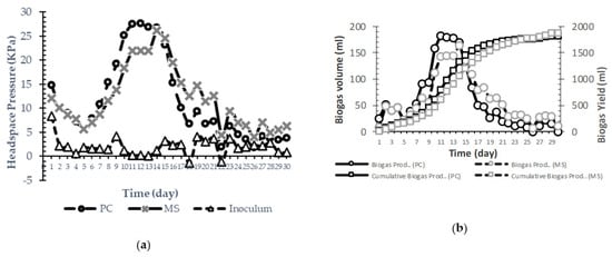 (a) The daily measurements of headspace pressure of PC and MS sludge; (b) the average daily specific biogas yield and average specific cumulative biogas yield of PC and MS sludge.