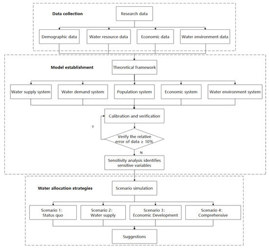 Before the system dynamics model is defined, the system analysis of the research object is first conducted to determine the modeling objectives, subsequently, the system boundary and each variable of the system is determined according to the system dynamics principles and methods based on the modeling objectives. Furthermore, the variables are categorized into state variables, rate variables and auxiliary variables according to the system element properties [18]. Figure 2 shows a schematic diagram of modelling the water allocations in Chengde City. First, we collect data on water resources, population, economy, and water environment in Chengde city and processed the data of each of the four aspects in a comprehensive and detailed way according to the research subjects. Secondly, we define and build the model according to the system dynamics principle. Finally, we analyze the results of the model runs and propose water allocation recommendations. The main procedures include three parts: (i) data collection: demographic, water resources, economic, and water environment data; (ii) mode establishment: water supply, water demand, population, economic, and water environment system; (iii) water allocation strategies: water conservation, industrial structure adjustment, even level source, and scientific management.