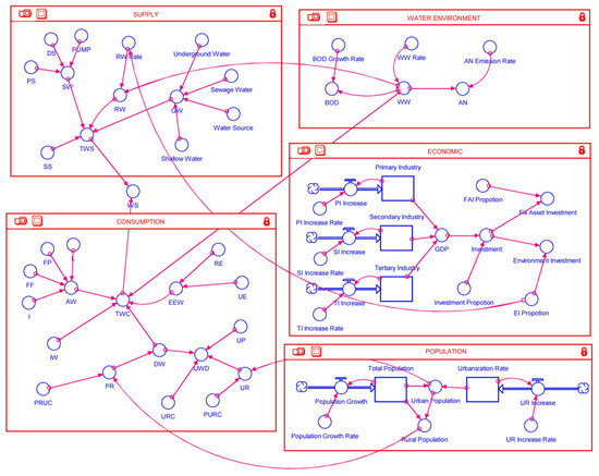 Causality analysis is a qualitative analysis of the system. It allows the initial construction of the main structure of the system dynamics model and further defines the functional relationships between the system variables, thus forming the basis of the system operation [20]. This system dynamics model is based on the administrative boundary of Chengde City as the model boundary, with a time scale of 2007 to 2016 and a time step of 1 year. The simulation period is from 2021 to 2025 with a time step of 1 year, and the year 2007 is used as the base year. This model is established by the distribution of water resources and water demand in Chengde City and is composed of five sub-system models: (i) population subsystem; (ii) economic subsystem; (iii) water supply subsystem; (iv) water demand subsystem; (v) water environment system. According to the relationship between subsystems, the system is simulated using the STELLA software package, and the overall model structure is obtained as shown in Figure 3.