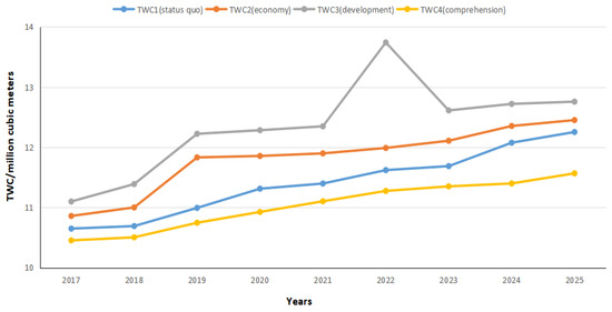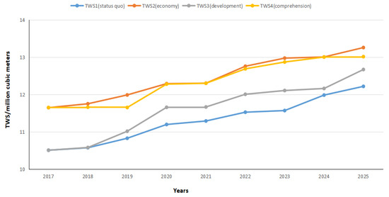 Scenario 2 is a water supply type on the basis of the status quo. It will reduce the rate of economic development to a certain extent, increase the rate of investment in urbanization and environmental protection, reduce the rate of the generation of wastewater, and increase the rate of wastewater recycling.