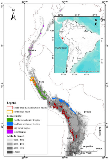 Location of the Santa river sub-basin in the Cordillera Blanca (Peru). Source: Adapted from Kaser [4].