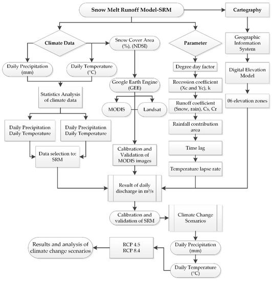 Figure 2 shows data processing for modelling snowmelt runoff from tropical Andean glaciers under climate change scenarios in the Santa river sub-basin. Briefly, observed climate data of temperature, precipitation, digital elevation model (DEM) and MODIS images were acquired to estimate the SCA [39]. Subsequently, the SRM model was applied to simulate the surface runoff of the sub-basin. Finally, the model was validated and calibrated to obtain future runoff scenarios under a climate change context.