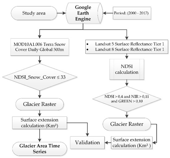 The SCA estimation was performed based on the MODIS Snow Cover MOD10A1 product with daily temporal resolution and 500 m spatial resolution [40]. All images from the period 2000 to 2017 [40,41] were processed using the GEE platform [42]. For SCA validation, Landsat 5 (Surface Reflectance Tier 1) and Landsat 8 (Surface Reflectance Tier 1) images were used by determining the Normalized Difference Snow Index (NDSI), as proposed by Riggs et al. [43]. The process consisted of classifying Landsat images into glacier and non-glacier [44]. Finally, the Terra and Aqua satellite MOD10A1 product was validated (Figure 3).