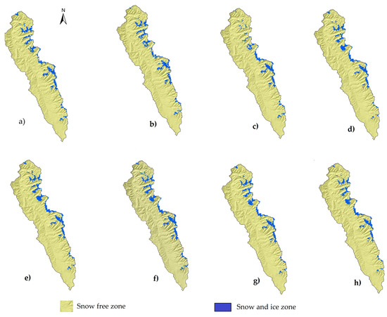 Table 1 and Table S2 show the percentage of SCA for MODIS and Landsat data products obtained on the same overlapping date. The highest percentage of snow was reported in 2009 (6.9%), while the lowest was obtained in 2016 (4.6%) for MODIS data. However, for Landsat data, the maximum value (6.5%) was reported in 2003 and 2008, while the minimum was reached in 2015 (5.1%). Figure 4 also presents the results of the spatial distribution of the SCA for both products in 2003, 2006, 2010 and 2016.