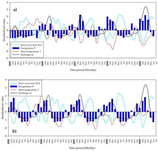 Correlation between standardized values of SCA, precipitation, average temperature and discharge (stations of La Balsa, Quitarcsa and Los Cedros) in the Santa River sub-basin (monthly) (2005–2009). (a) Yanamarey station and (b) Artesonraju AP2 station.