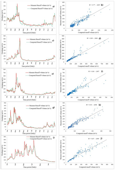 Figure 6 displays the time series and scatter plots of the calibration for 2005, 2006, 2007, 2008 and 2009. Simulation for 2005 was performed using information from the observed sum at the three hydrometric stations (La Balsa, Quitarcsa and Los Cedros). In the calibration results, the Nash–Sutcliffe determination coefficient was 0.80 and Log Nash–Sutcliffe 0.67, with a volume difference of 3.95% between simulated and observed (Table 2). Highest adjusted months were from November to April, during spring and summer seasons. It reached an average discharge of 140 m3/s, due to rainfall and glacier melt (Figure 6a). In autumn and winter seasons there was not a perfect match of observed and simulated discharge, thus no adjustment was made in SRM model.