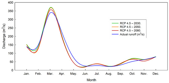 The result of RCP 4.5 showed flow variability between the projected years. In this sense, the highest flow months were from January to May, justified by the wet season, while the lowest flows were reached between June and December (dry season). The average annual discharge reports a decrease over the years of assessment. Namely, for 2030, 2050 and 2080, 104.0, 101.3 and 98.8 m3/s are projected, respectively (Figure 7 and Table S4).