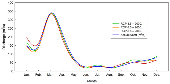 Simulated discharge in the Santa River sub-basin under changed climate RCP 8.5 in the year 2030, 2050 and 2080.