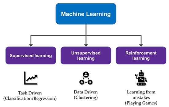 In addition, ML technology based on learning methods can be classified into three types of learning: (1) supervised learning, (2) unsupervised learning, and (3) reinforcement learning. First, supervised learning is a technique that provides data and labels (answers) for a problem. Humans wish to obtain solutions using learning data, and then estimate and provide appropriate labels when inputting new unlabeled data. This technique is primarily used for object recognition, label estimation probability, and regression analysis. Unsupervised learning is a technique where unlabeled data are received and new characteristics, patterns, and classes are identified from the data via learning. It is primarily used to solve problems such as clustering, feature extraction, and dimensionality reduction. Finally, reinforcement learning is a method in which an agent defined within an environment recognizes the current state and selects an action or sequence of actions that maximizes compensation among selectable behaviors. ML technology allows different problems to be solved based on the learning type, as summarized and presented in Figure 1.