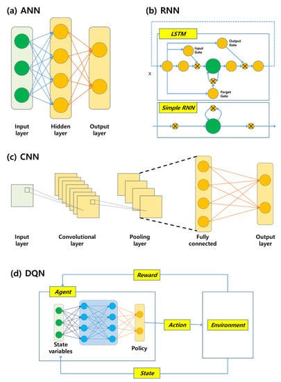 Architecture of several neural network structures. (a) ANN; (b) RNN (including LSTM); (c) CNN; (d) DQN.